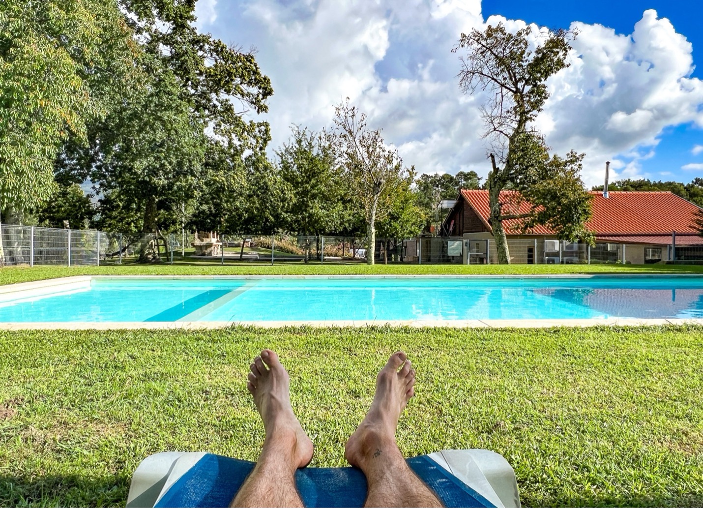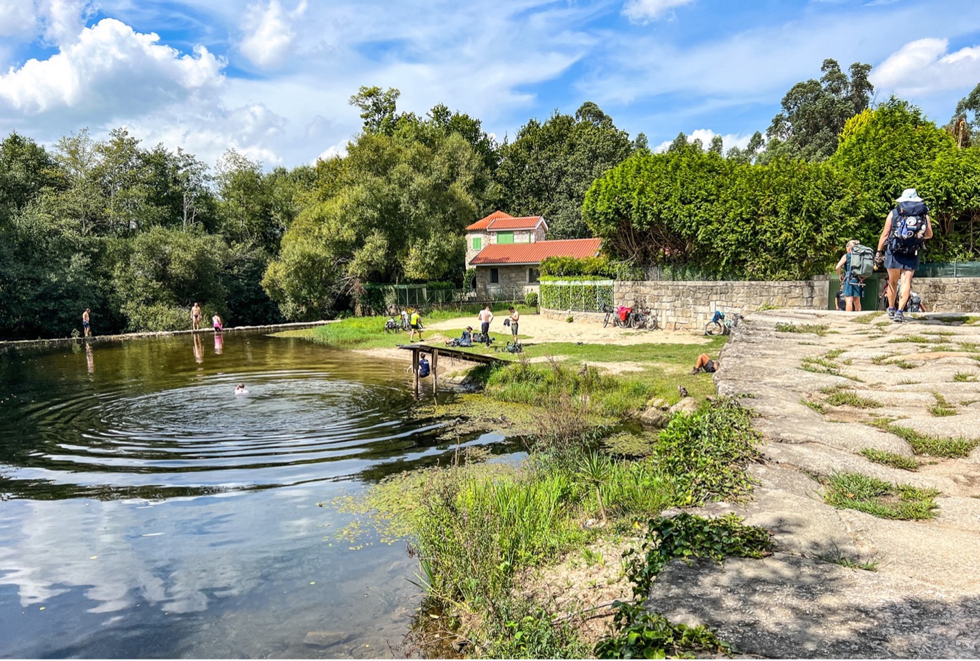 The ascent took most of the morning and, after crossing the summit, we started down a wooded path through villages and vineyards. In the next valley, the midday sun beat down on us as we sweated through heat-soaked fields. Eventually, we came across a pond with several pilgrims lounging in the grass and taking advantage of the swimming hole to cool off. It looked enticing but we needed to get lunch before the restaurants closed for the afternoon, so we pressed on.