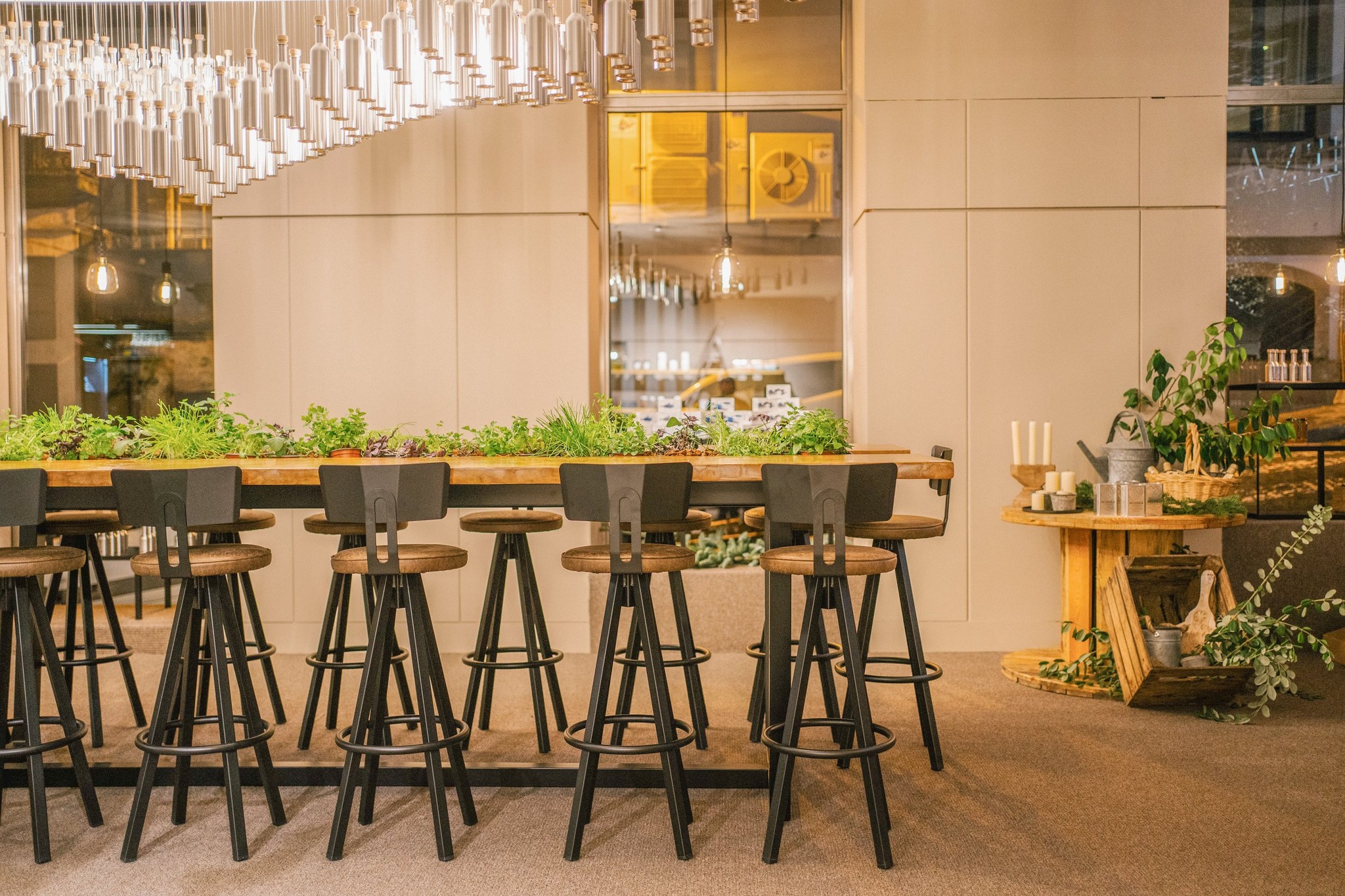 Fabrica do Azeite also offers an extensive selection of bioproducts, from various olive oils, canned goods, jams, nuts, salt, teas, chocolates, charcuterie boards, and more. Guests can sample a multitude of regional flavors that pay homage to the production of olive oil on a large farmhouse-style table with green plants.