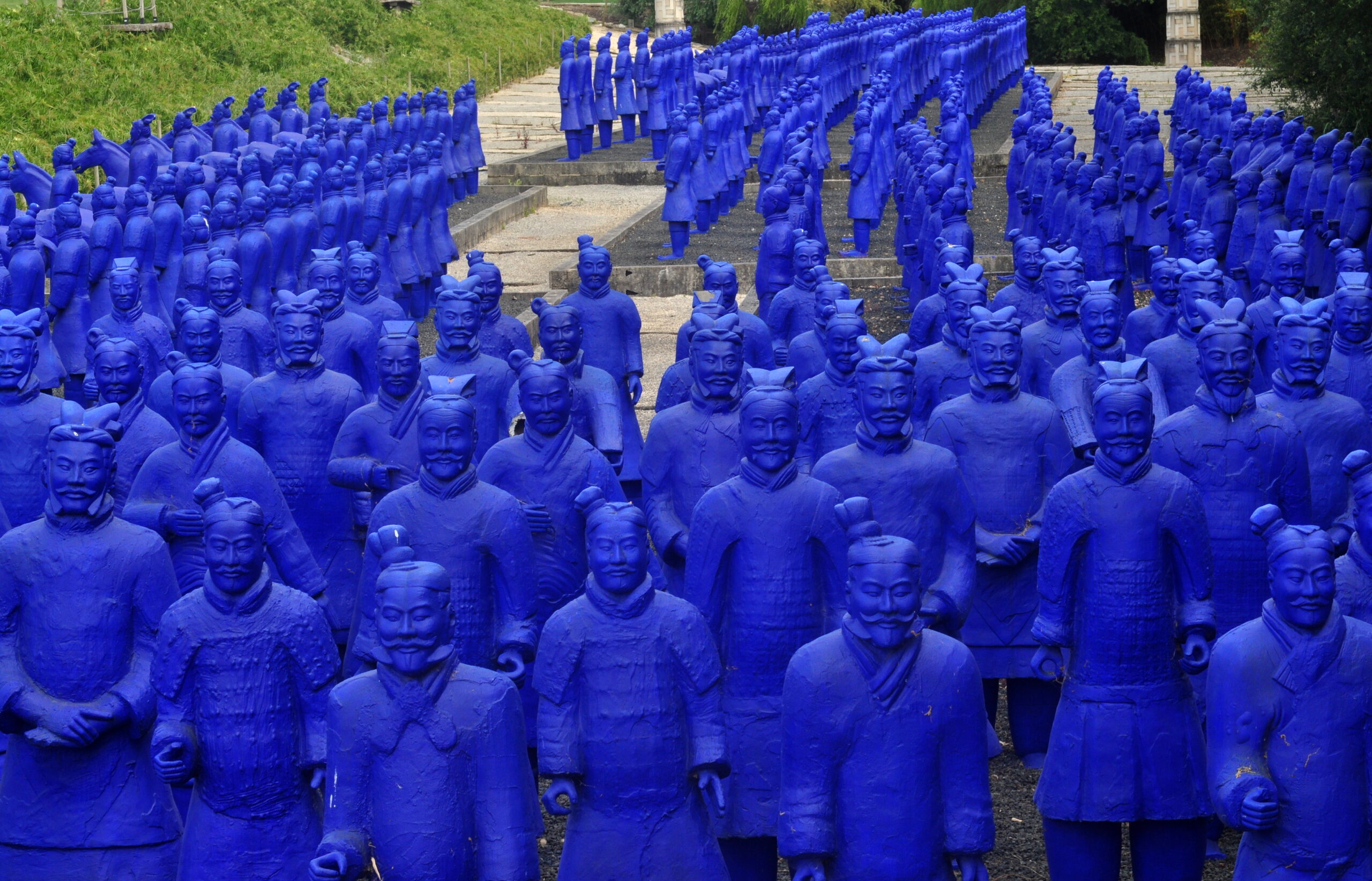 A vast sculpture garden filled with giant Buddhas, terracotta-style figures, and contemporary art set across rolling vineyards.