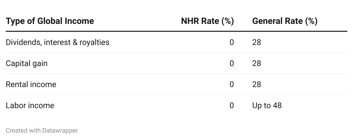 The Non-Habitual Resident (NHR) tax regime in Portugal attracts thousands of residents by offering reduced tax rates and even full tax exemptions for the first ten years of residence. The NHR tax regime was introduced in 2009 and is available to all new tax residents in Portugal that were not tax residents in Portugal for the 5 years prior. Let’s go through the main benefit of the NHR tax regime.