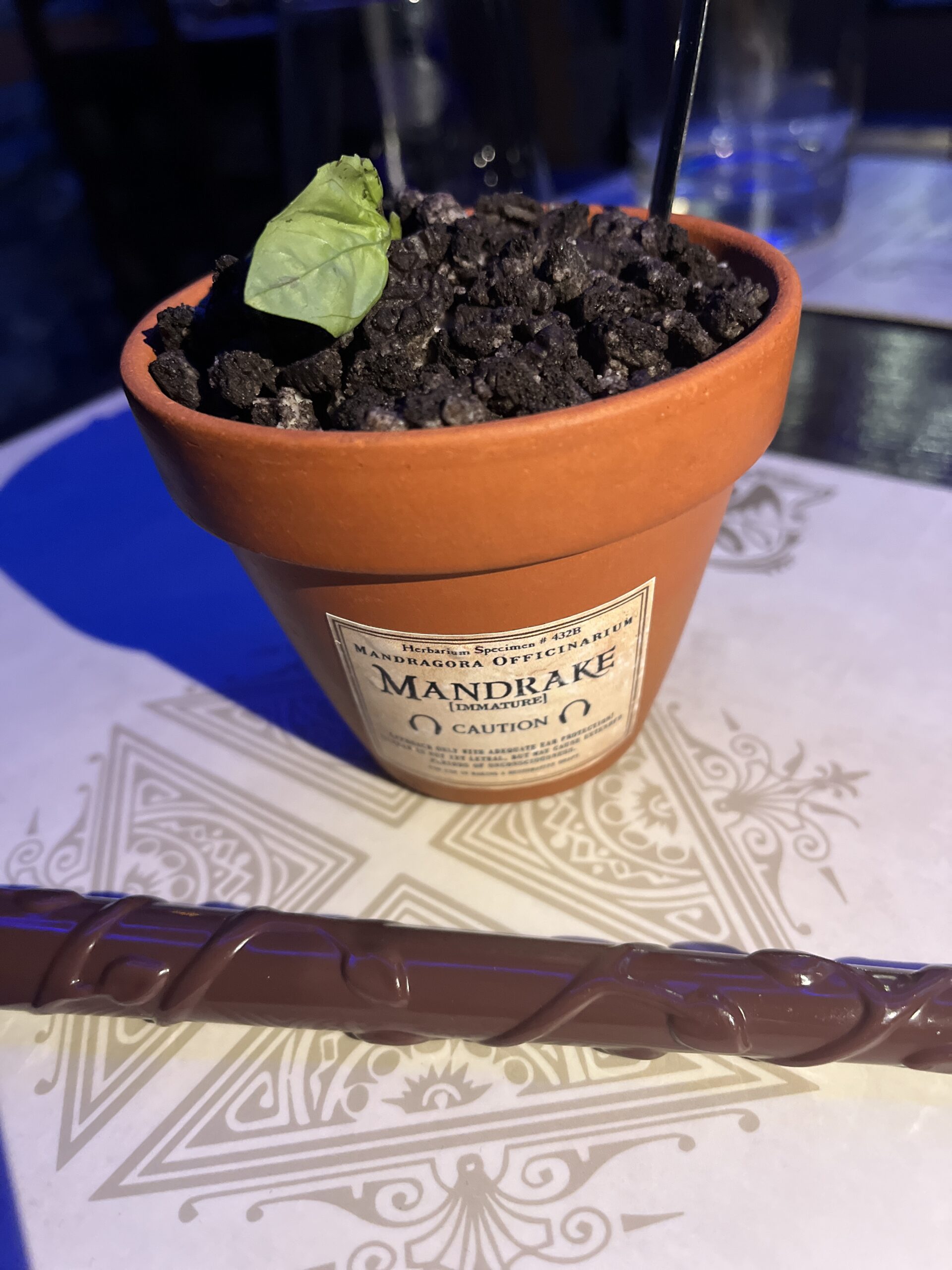 Besides the drinks, the only food option is all you can eat pizza, which is €25 per person for adults and €12.50 for children aged 4-10 years old. There are five desserts on the menu and they excel at keeping with the Harry Potter theme, whether it’s “Dragora Vase,” a Mandrake Oreo mousse in a flower pot, “Monster Book,” which is a brownie with ice cream with a magic tongue sticking out of the book, “Magic Cauldron,” “Strawberry Charm,” or a small Happy Birthday cake. These range between €4.50 and €7.