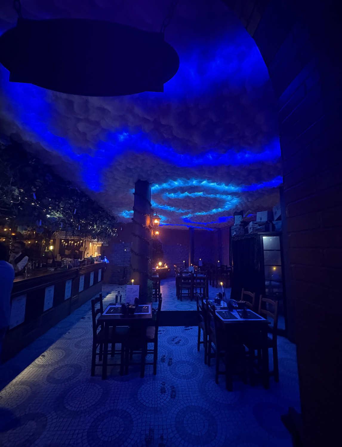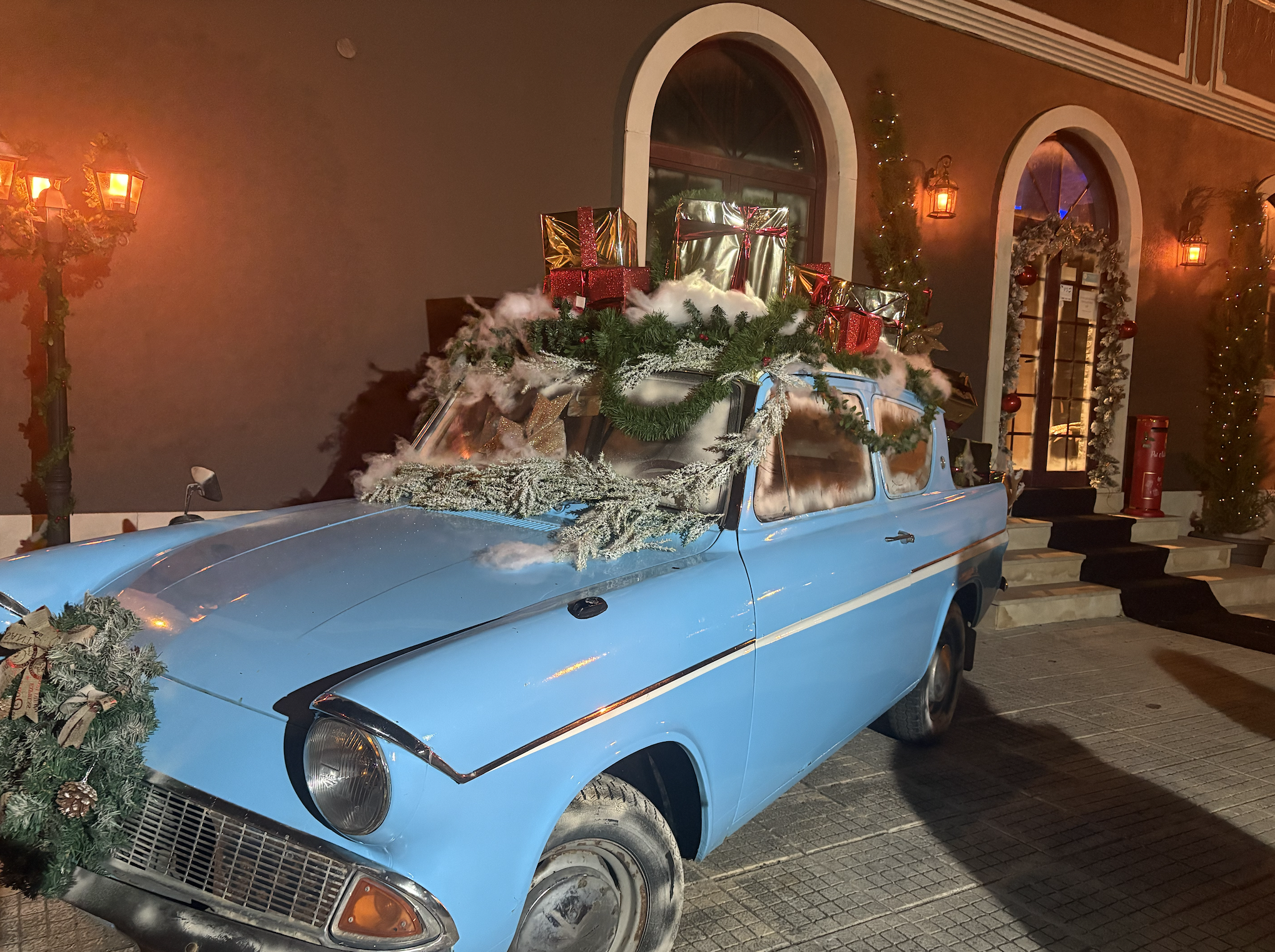 Your experience at Plataforma 9 3/4 (known as Plataforma.Rodizio on Instagram) begins with a role call at the front door by a “professor” dressed in a Hogwarts-like robe.  The professor first asks the group of guests if they can remember a spell from Harry Potter to get the front door to open. When the group recites it all together, the door opens and then, just like being students at Hogwarts, each reservation is called, and guests are welcomed into the restaurant individually. A blue car, meant to resemble the Flying Ford Ford Anglia 105E Deluxe from Harry Potter and the Chamber of Secrets, sits just outside the entrance, which guests can pose with for photos with as they wait to be called. I visited during the Christmas season and the Flying Ford was decorated with presents and snow-dusted wreaths. The professor greeting us at the door also raised his wand into the air and “made it snow” before he called our names, quite a special touch when you’re in a part of Portugal that hasn’t seen snow since 2006.