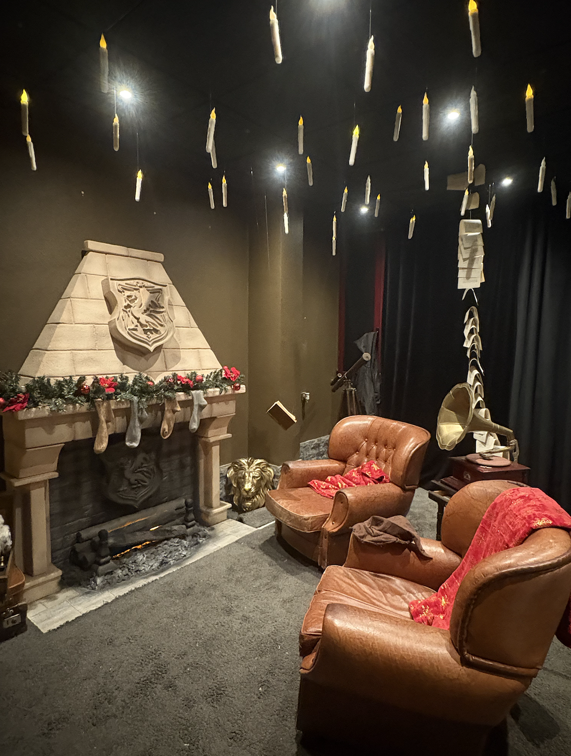 In addition to the magic moments I’ve already mentioned, Plataforma 9 3/4 did its best to entertain and enchant guests during the entire 2-hour experience. Not only did we get a chance to take pictures with Hedwig and watch it snow, but we also got to play with a wand at our table and use it to light the candle at our table. There were also four jellybeans in a tiny cauldron at our table (Bertie Bott’s Every Flavor Beans or not? You will have to find out.) and a moment when we were asked to think of a magic word and use it to make a cauldron bubble over and mist over our entire table. There were also moving pictures on the stairs between the ground and first floor, making me feel very much like we were at Hogwarts.