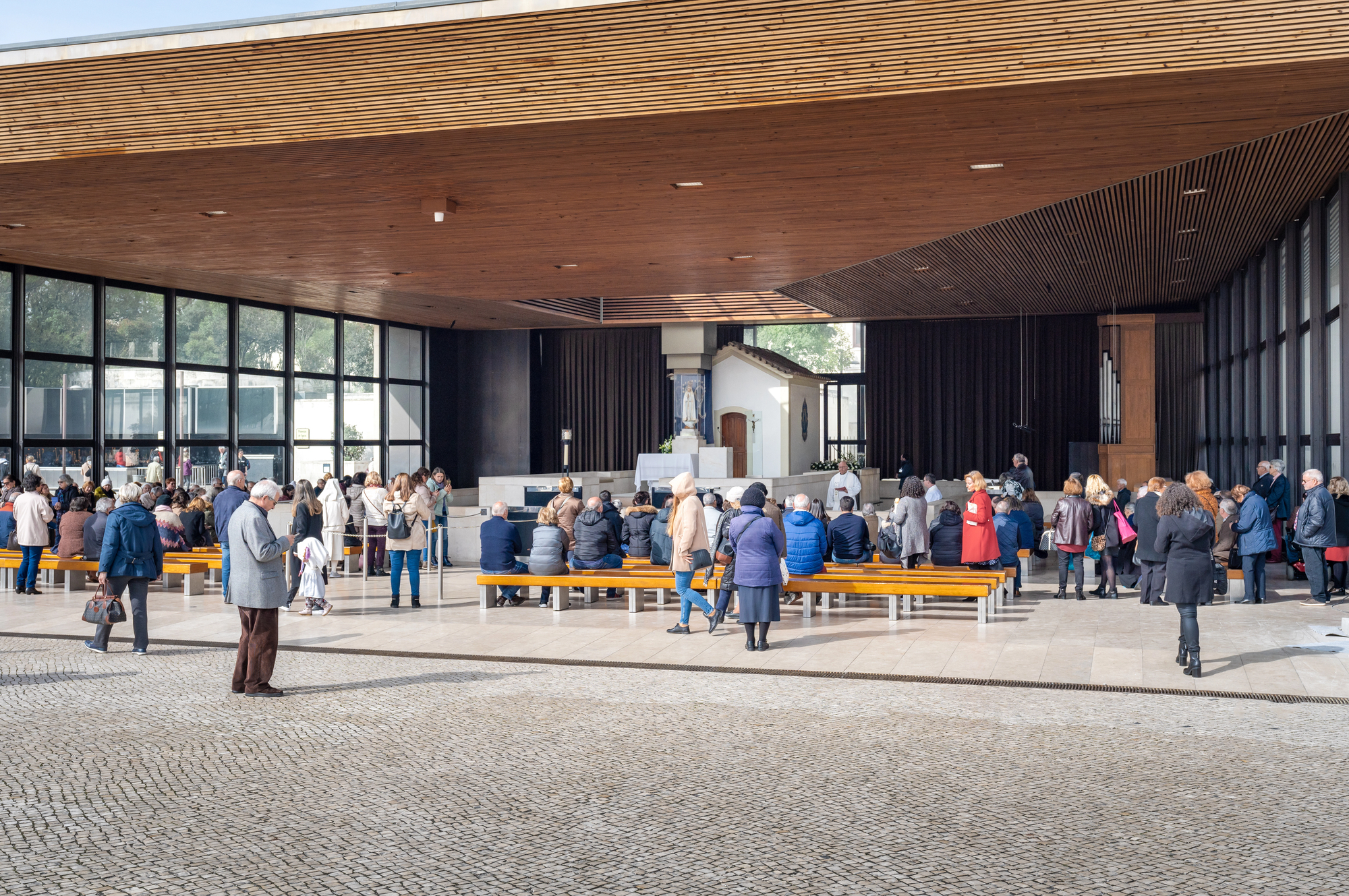 Across the esplanade from the older Basilica of Our Lady of the Rosary stands the round, ultra-modern Basilica of the Most Holy Trinity, completed in 2007 for the 90th anniversary of the apparitions. Designed to handle huge crowds, it has approximately 8,633 seats and a 125-meter diameter interior with no intermediate supports. That combination of size and minimalism surprises first-time visitors expecting only old-world architecture.