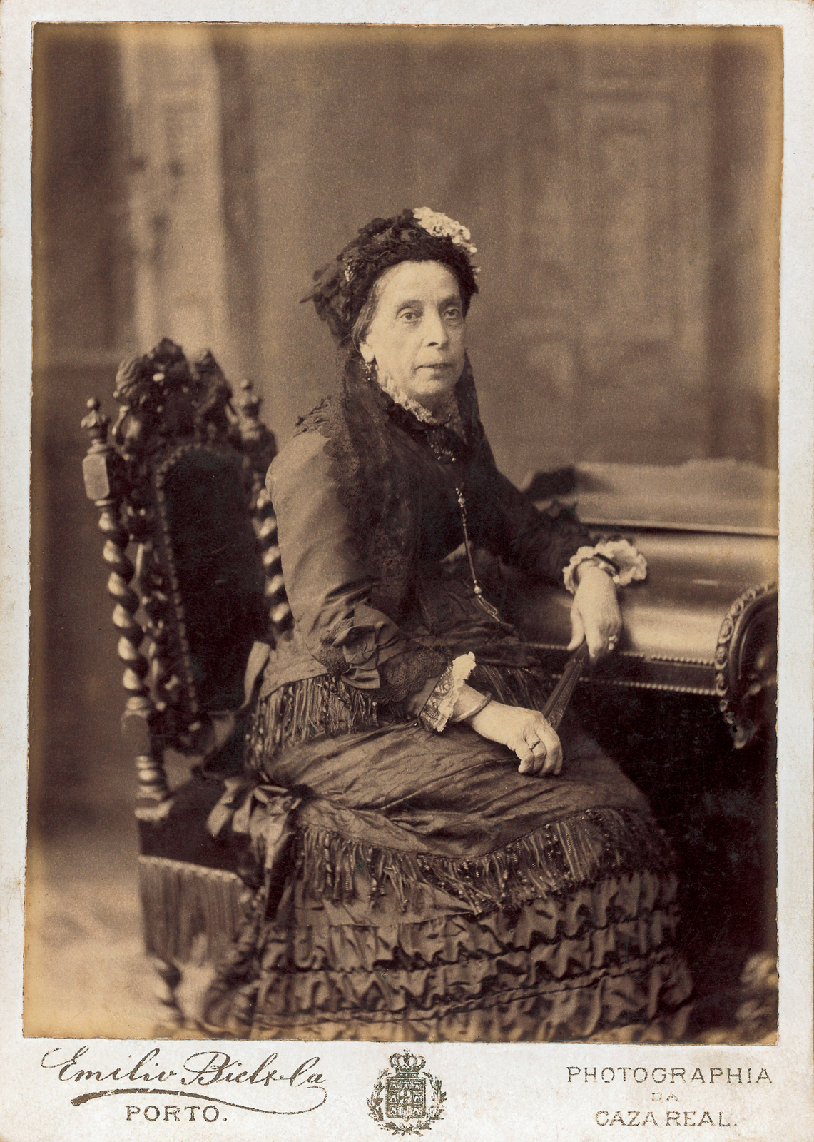 She was born in Godim, near Peso da Régua, where she spent her childhood and adolescence. She married for family convenience to a cousin, a bohemian and womanizer, who left her a widow at just over 30 with two children, but heir to a fortune. Alone, she negotiates, controls, invests, helps the needy, takes care of her children, sues her children… and dies an octogenarian, much richer than she was born, with farms producing 1500 barrels of wine a year. She leaves a fortune valued at 5,907,323$000 réis, which includes 30 estates, well-stocked warehouses and palaces, art collections, jewelry, bonds, loans, and cash.