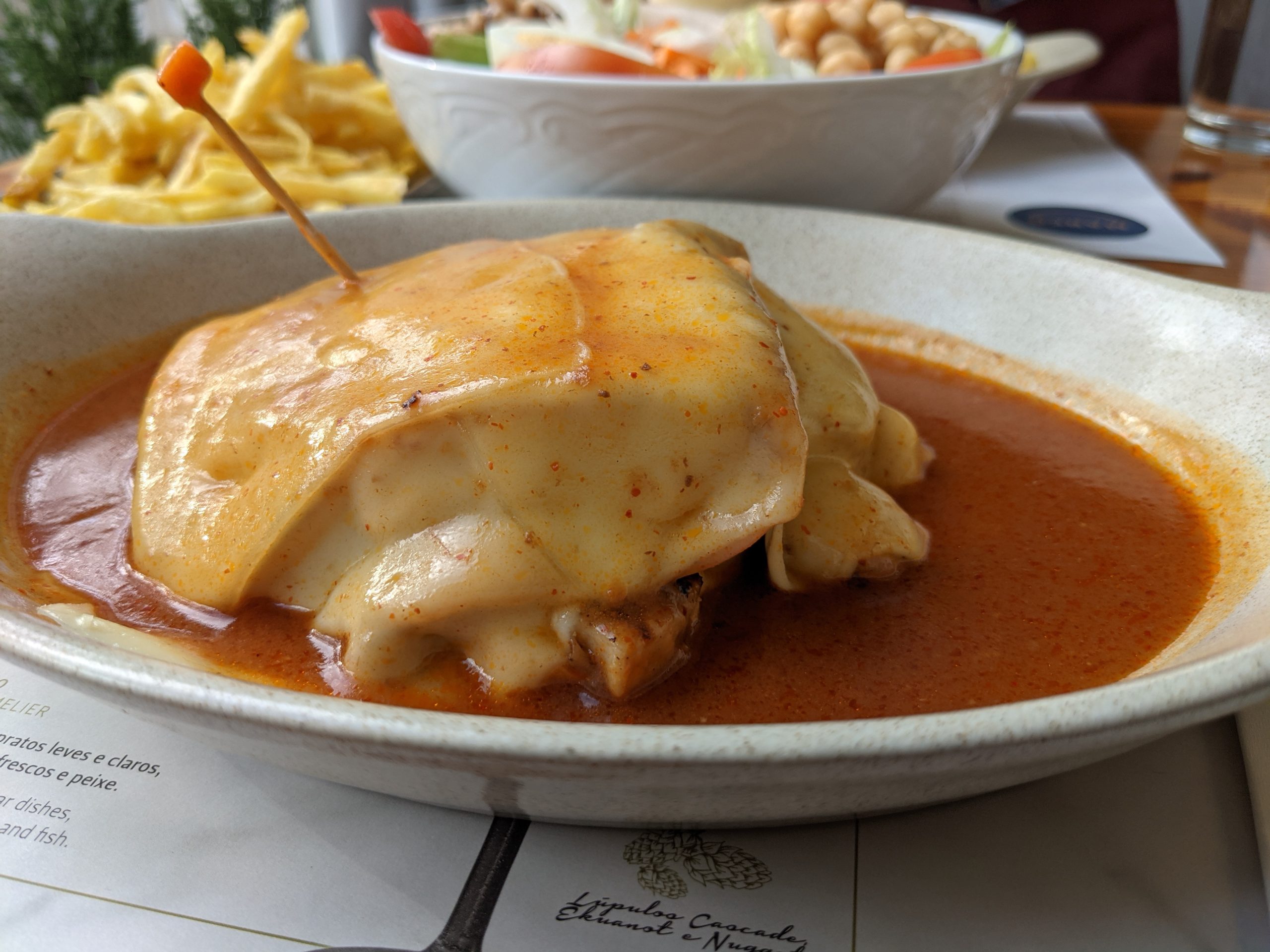 The Francesinha is a hearty sandwich from Porto created in the 1950s by a Portuguese cook inspired by French croque-monsieur sandwiches. He added layers of cured meats, melted cheese, a fried egg, and a rich tomato-beer sauce. It quickly became a symbol of Porto’s comfort food and remains one of the city’s most popular dishes.