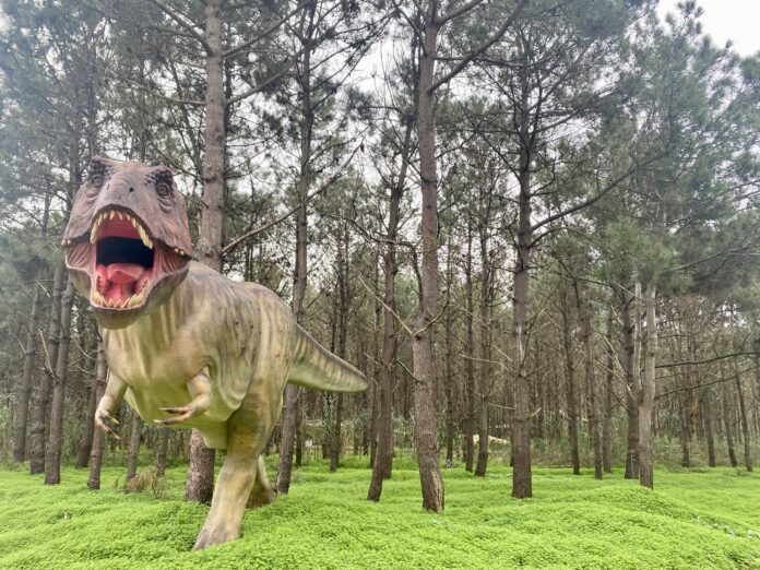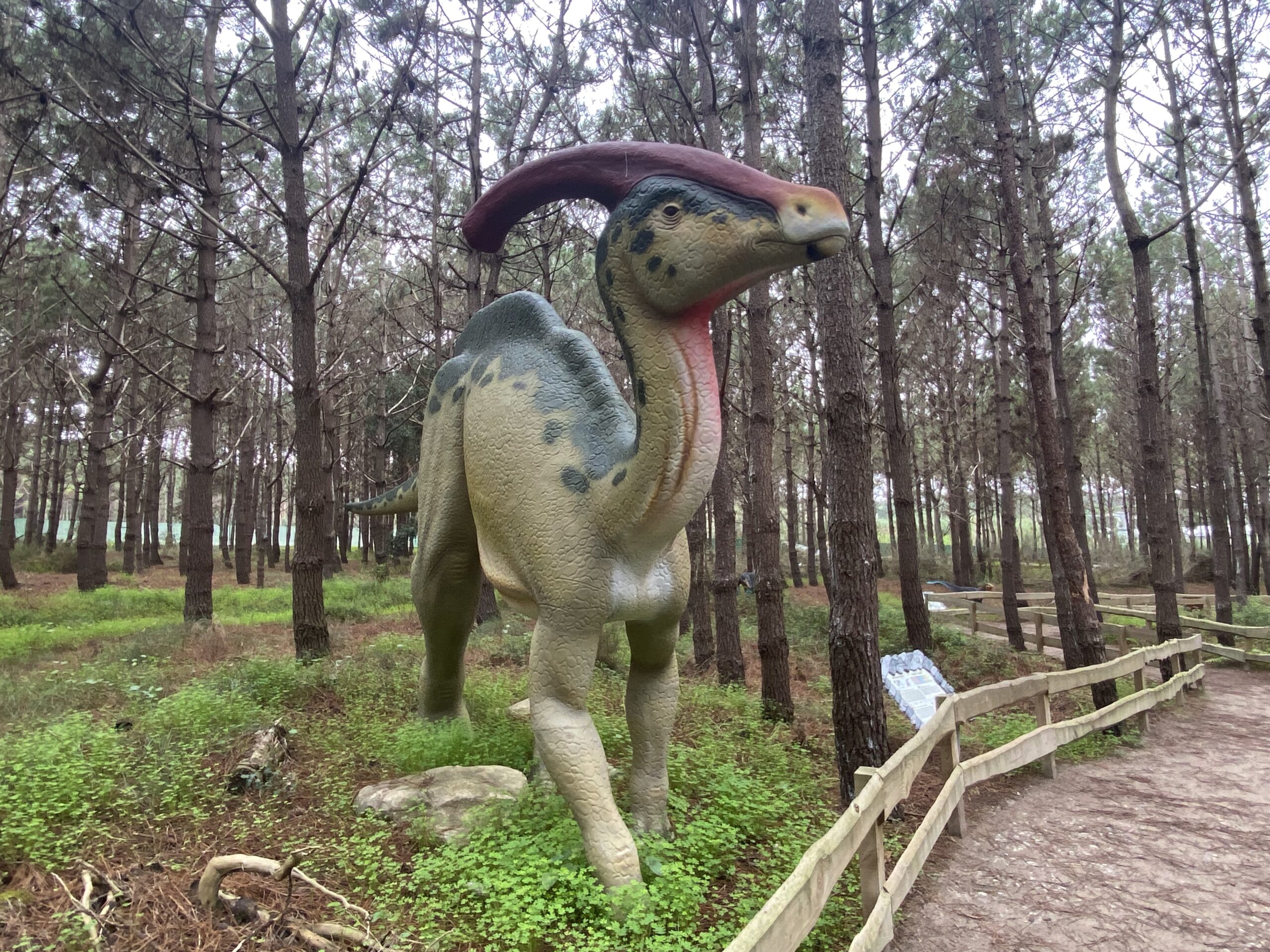 Once you exit the ticket office/gift shop and fossil exhibition areas, you emerge onto the edge of a large pine forest behind the main building where over 200 dinosaur models are positioned across six different zones starting in chronological order with the Paleozoic, Triassic, Jurassic, and Cretaceous periods. You can also do as I did and start with the Sea Monsters zone closest to the Dinosaur Exhibition and Museum. Ice Age opened in 2023 and features a display of a saber-toothed tiger and a woolly mammoth. Another zone is set to open in 2024.