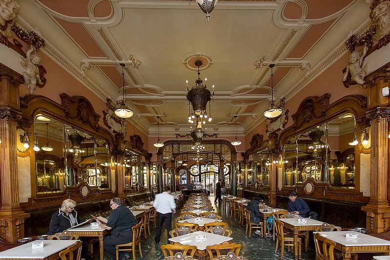 The marble-topped tables and leather chairs are reminiscent of a bygone era and offer a comfortable yet sophisticated setting for enjoying a meal or a drink. The combination of mirror frames, soft lighting, marble details, and smiling busts envelops the space in a golden, comfortable atmosphere, making the Majestic a luxurious retreat for relaxation and conversation. It is worth mentioning that dining in such a historic and luxurious setting doesn’t come without a cost as prices here are higher than other cafés in Porto.