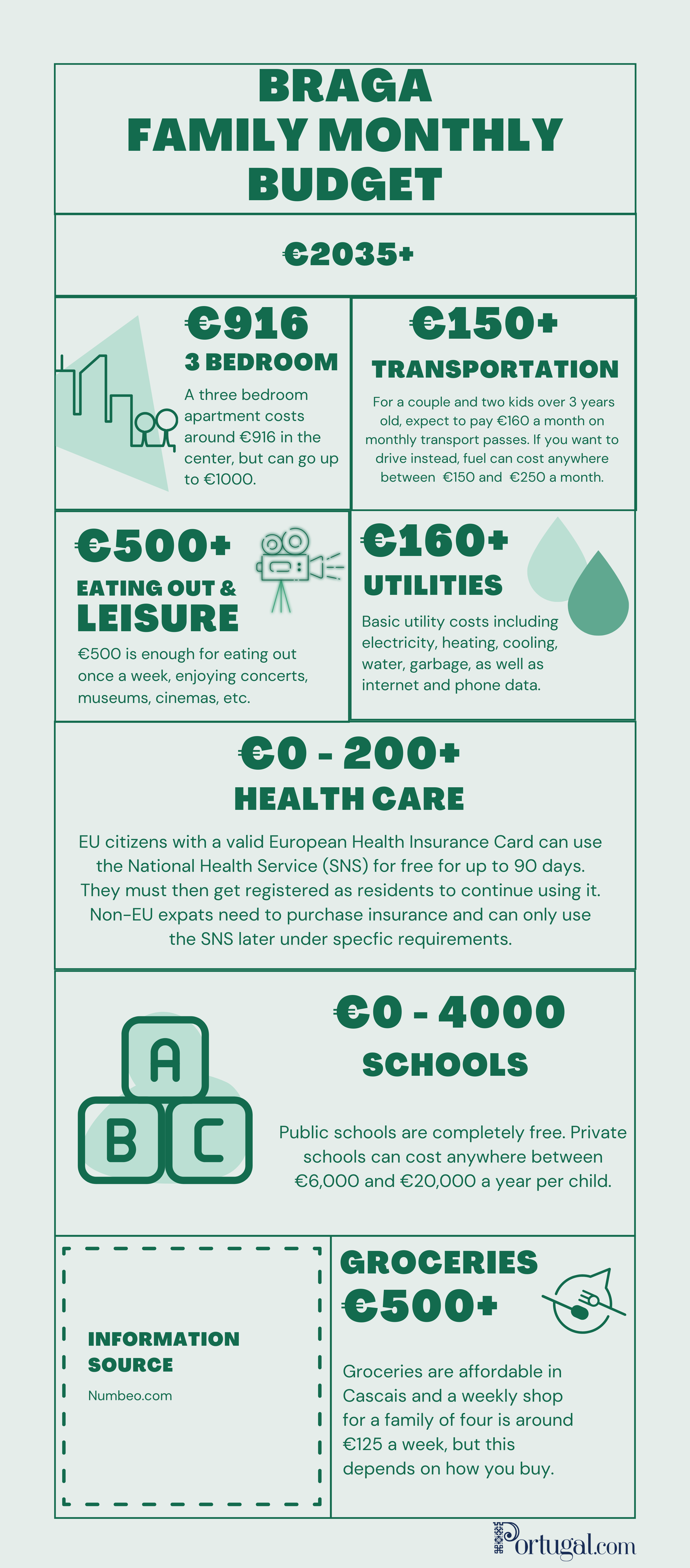 Groceries for a family of four in Braga should cost around €125 to €150 a week, so budget at least €500 a month.