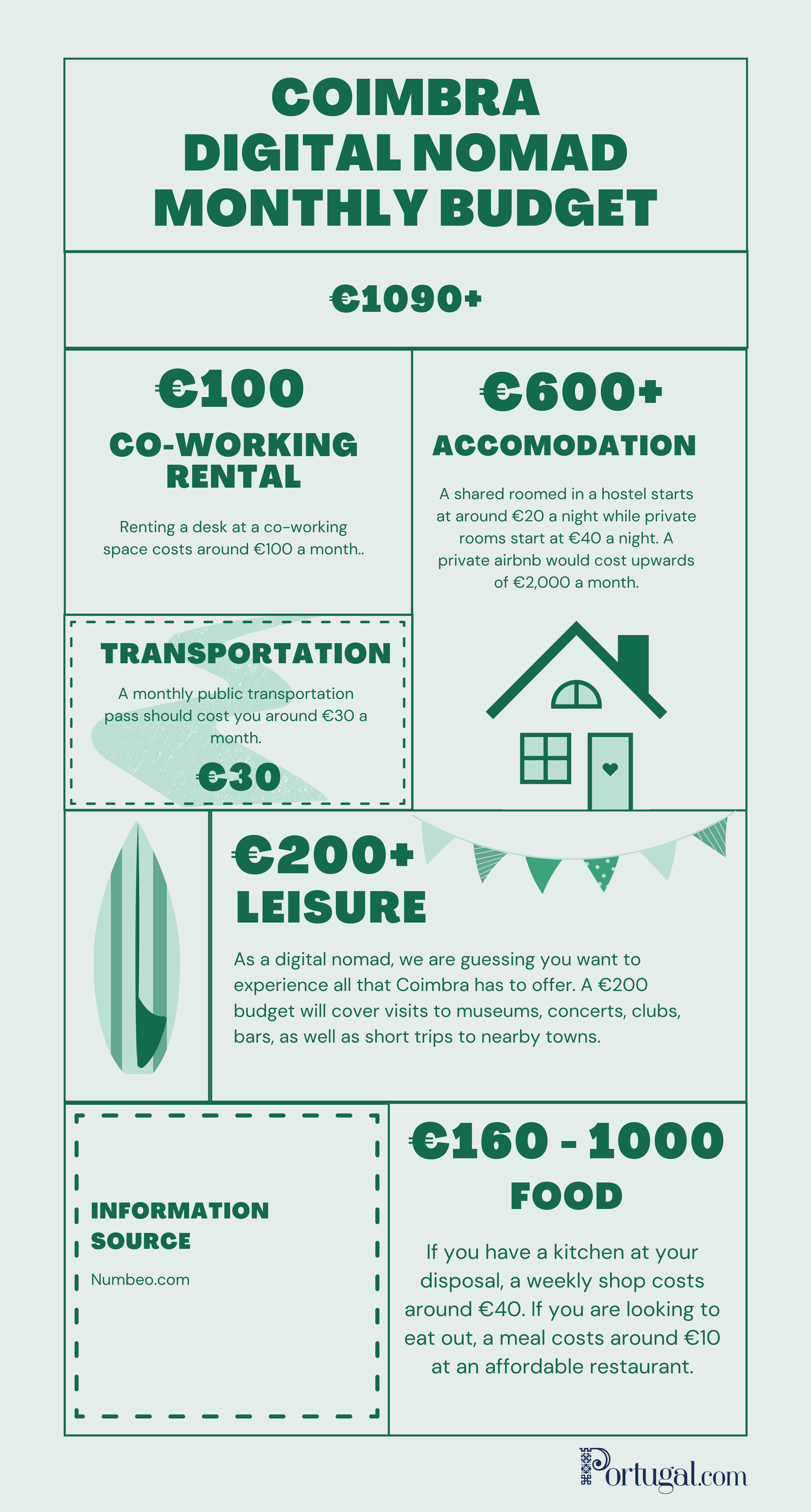 The monthly budget for an expat in Coimbra, Portugal, is at least €1,000 if you want to live in the center.