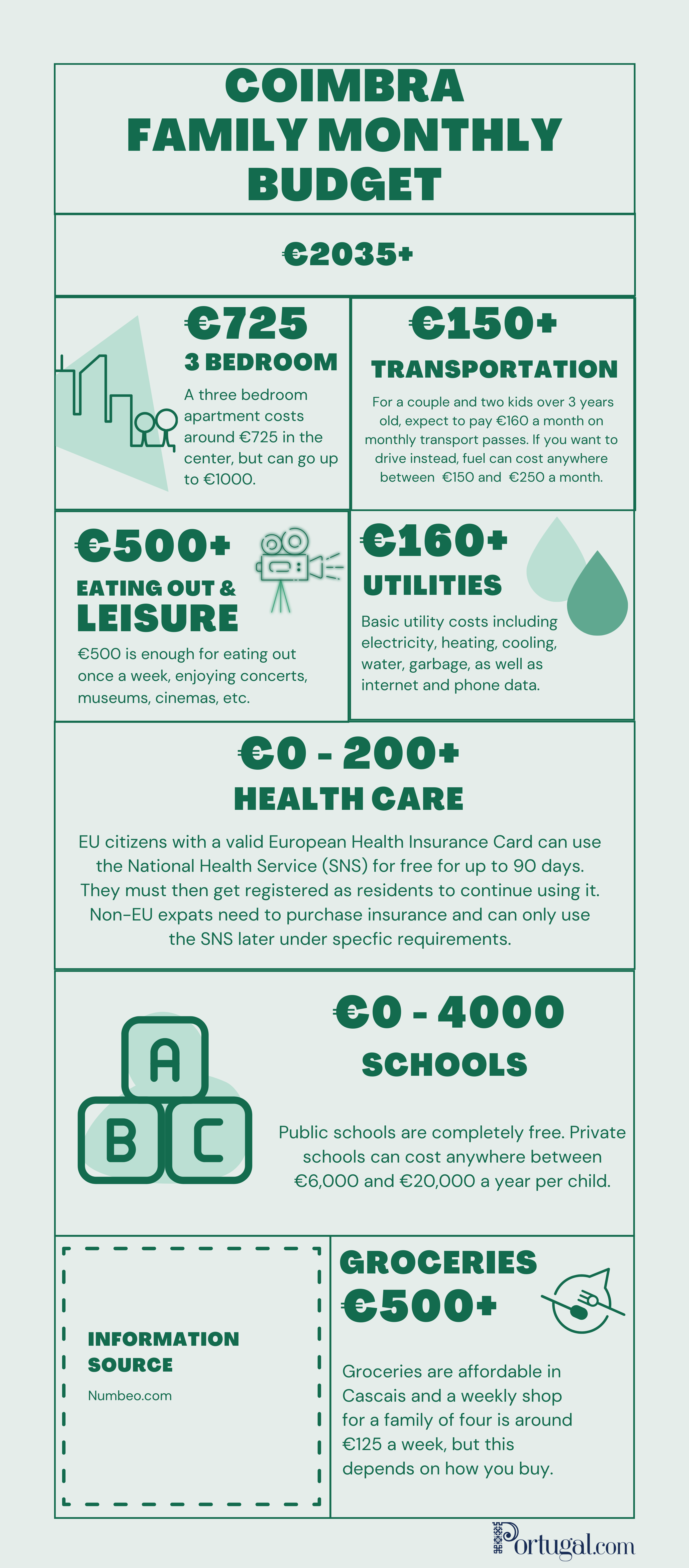 Expect to spend at least around €2,000 a month for a family of four in Coimbra, which is more than double the budget of a single expat.