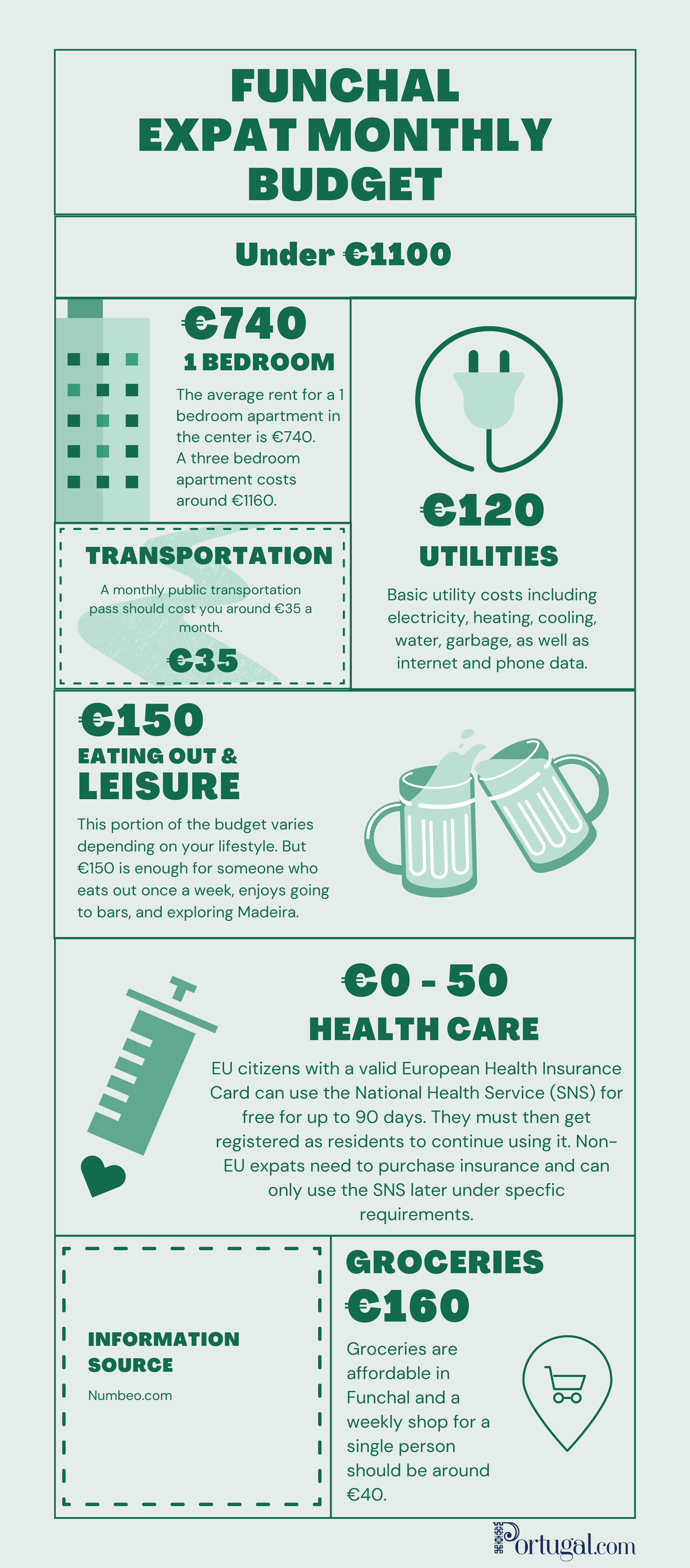 On average, a single expat will need €1260 a month in Portugal on average.