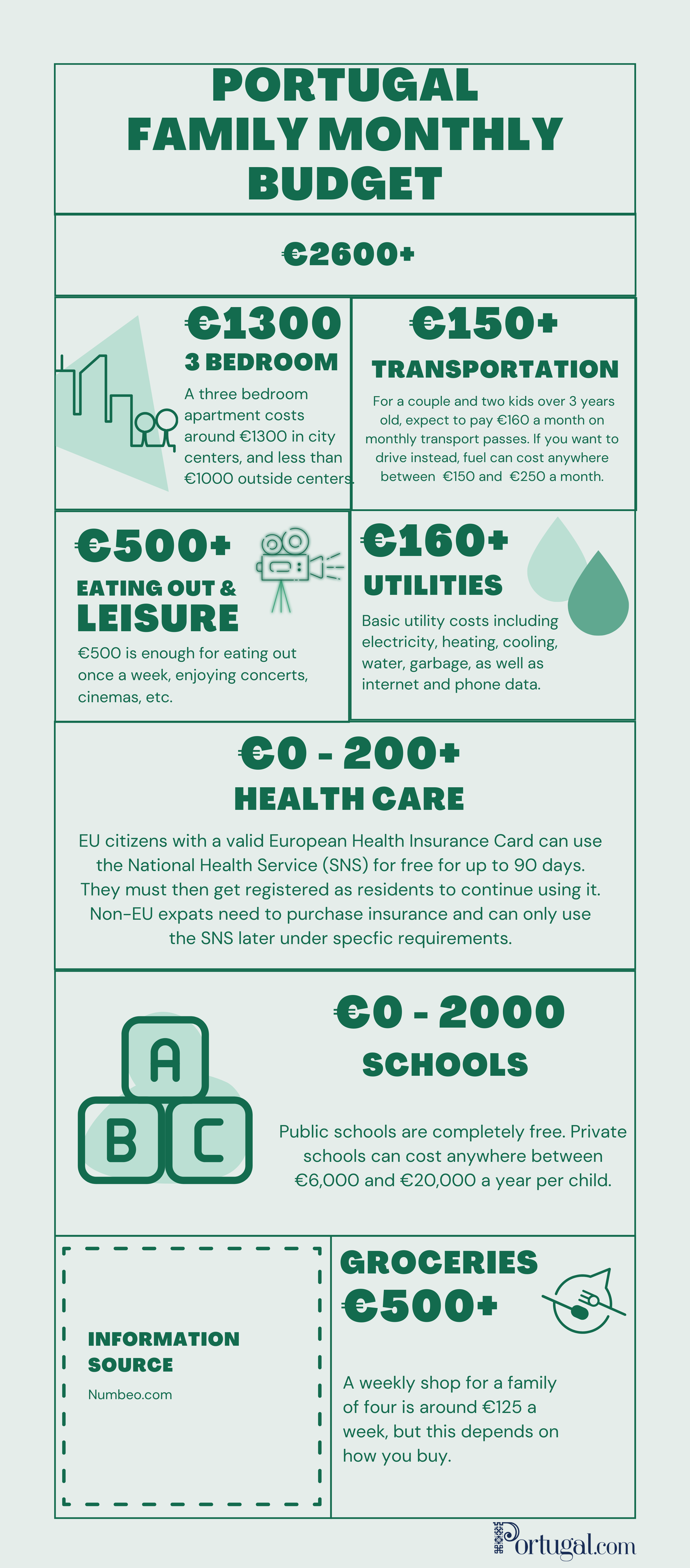 As a family of four, expect to need at least €2600 a month in Portugal on average.