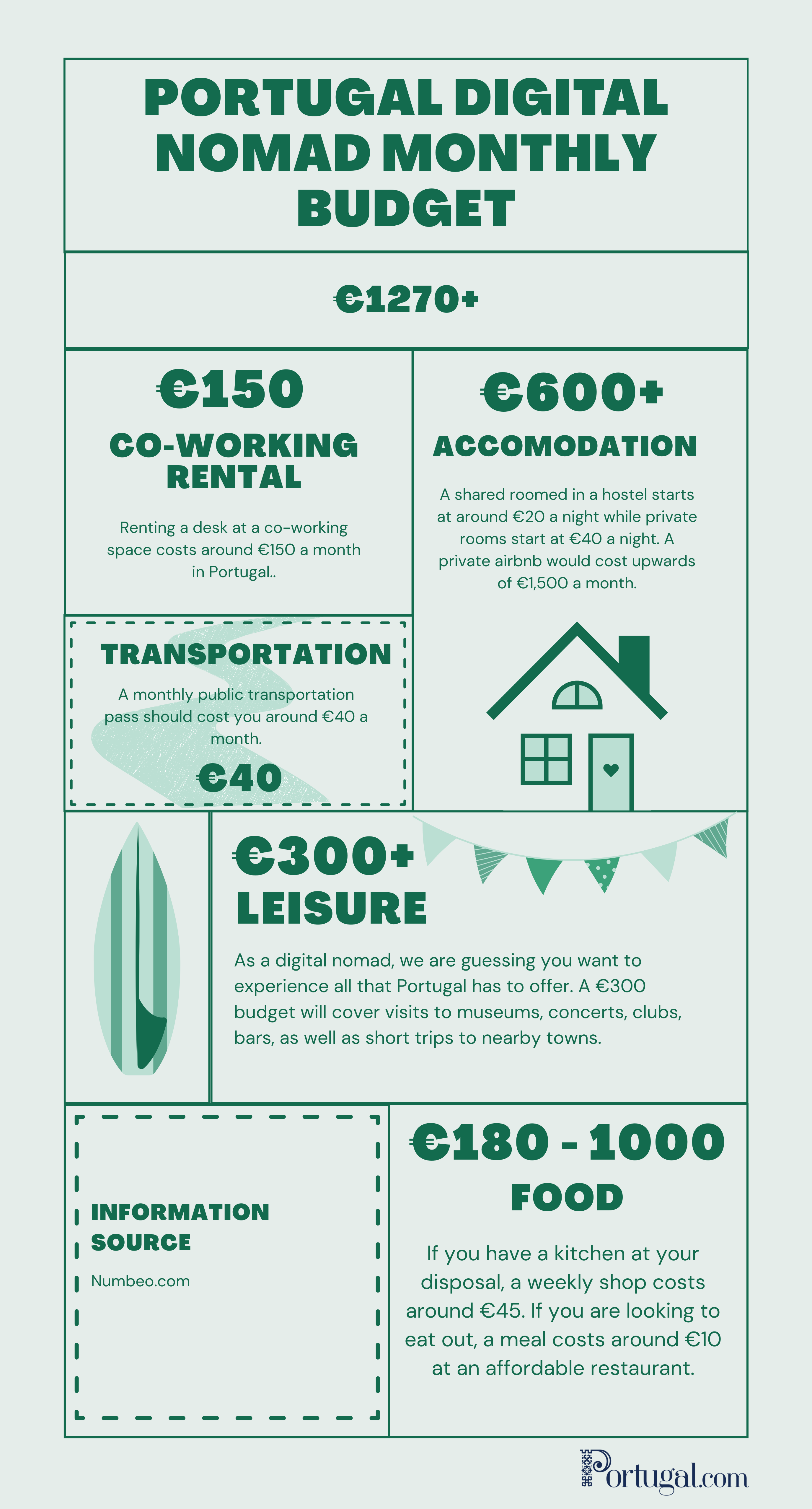 We’re guessing you want to enjoy all that Portugal has to offer as a digital nomad. We recommend budgeting around €300 for leisure activities, including eating out, museums, etc.