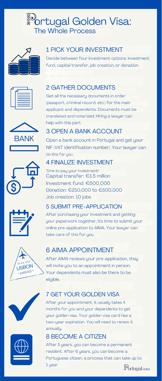 - Or invest a minimum of €500,000 in an already existing Portuguese business and create a minimum of five new full-time jobs in that business within three years.