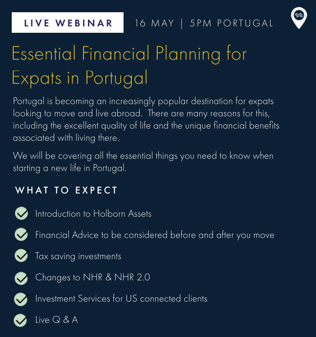 Want to become part of the large community of US expats in Portugal? Sign up for Holborn Assets’ live webinar on the challenges facing US connected clients moving or living in Portugal. Find out all about the financial perks of moving to Portugal and have all your burning questions answered. The event is scheduled for May 16 at 5 pm (Lisbon Time) / 12 pm EST. If you would like to schedule a one-on-one call instead, you can book one here.